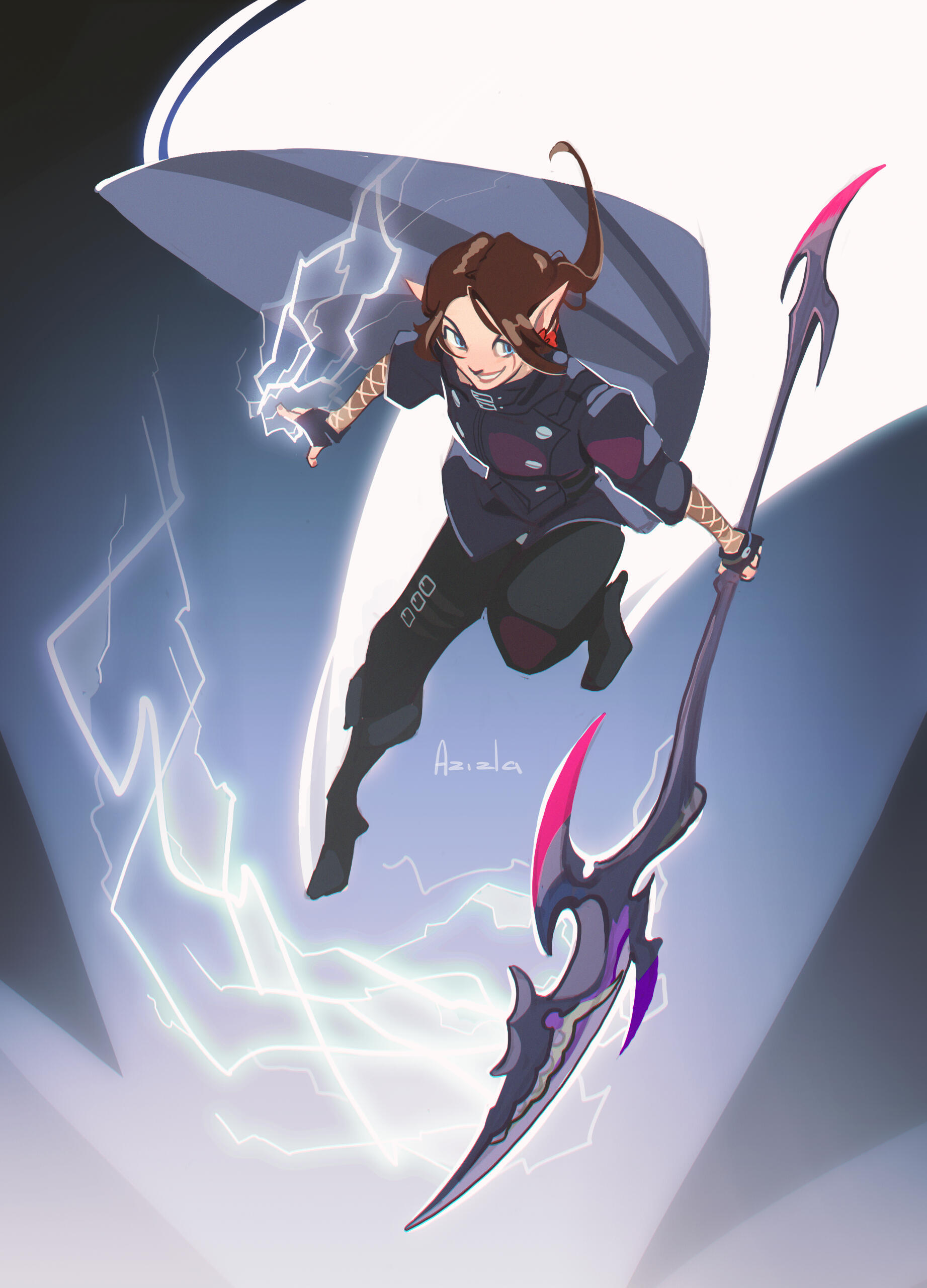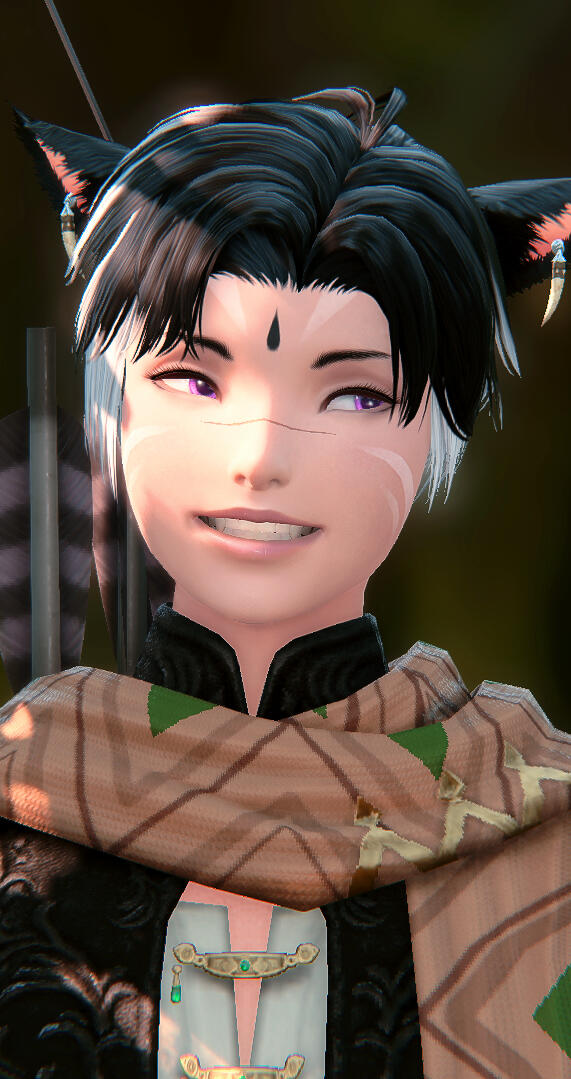A hunter-scholar with all the chaotic energy of a coeurl kitten, Zekhi carries the legacy of her now-faded tribe squarely upon her shoulders.Weaving birdsong and whistling like a Bard might weave a tune, she sojourns the Star in hopes of cataloging and hunting mightier and mightier prey. Or, when in cities, making a bit of mischief for herself.